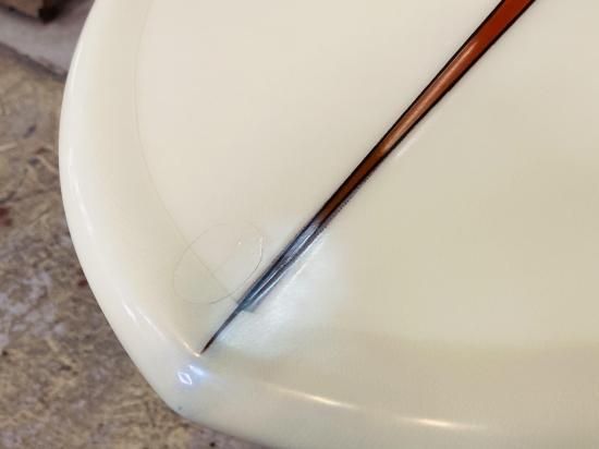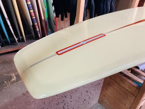 Made in California, Michael TakayamaシェイプのAnnihilatorBrewer モデル。深めのノーズコンケーブ、テールエンドは特徴的なストレートなアウトラインにテールキックの付いた美しいノーズライダーです。ボトムに2箇所のクラック(クリヤーテープ付)がありますが全体的に綺麗なボードコンディションです。